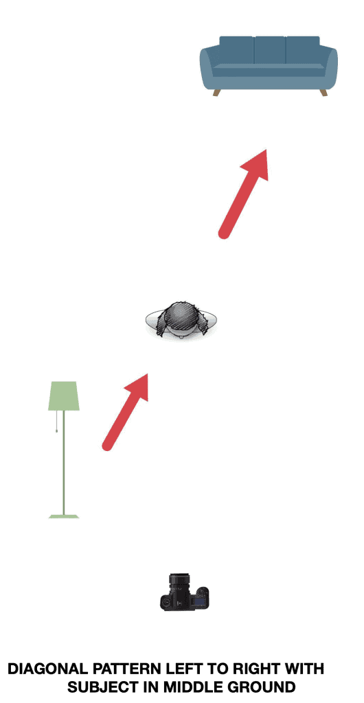 The diagonal line pattern is when you place objects in all three zones diagonally across your frame either left to right, or right to left, from front to back (foreground to background).