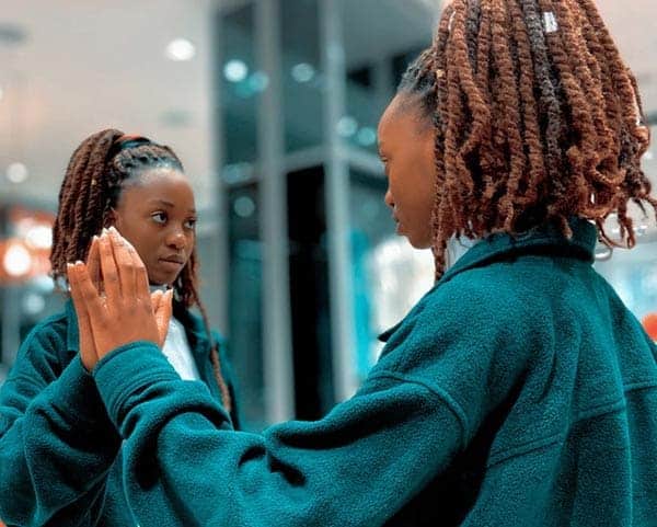 If they bring their hands together in some fashion, or stagger them slightly, that will create a diamond shape with a point at the top. By the way, this technique works best when your subject is standing although they could be sitting on a bed and raise their arms if, in your opinion, the composition works.